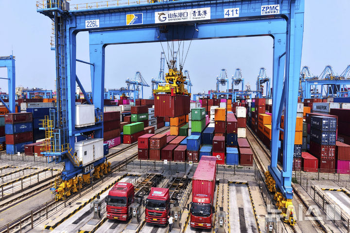 [칭다오=AP/뉴시스] 중국 산둥성 칭다오항 컨테이너 부두에서 선적작업을 하고 있다. 자료사진. 2025.05.26 |