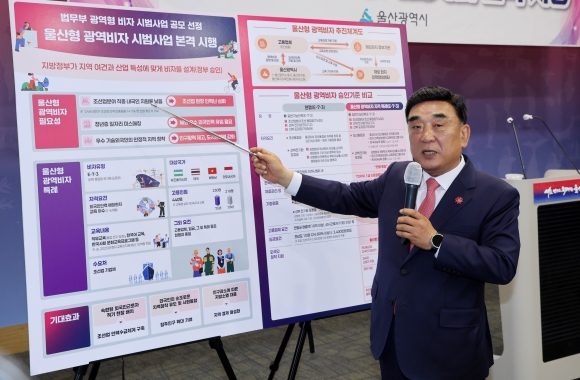 김두겸 울산시장은 26일 시청 프레스센터에서 기자회견을 열어 “울산시가 법무부 주관의 ‘광역비자 시범사업’에 최종 선정돼 조선업 등 산업계의 인력난 해소는 물론 외국인 숙련 인재의 안정적인 지역 정착과 인구 활력을 높일 것으로 기대한다”고 밝혔다.