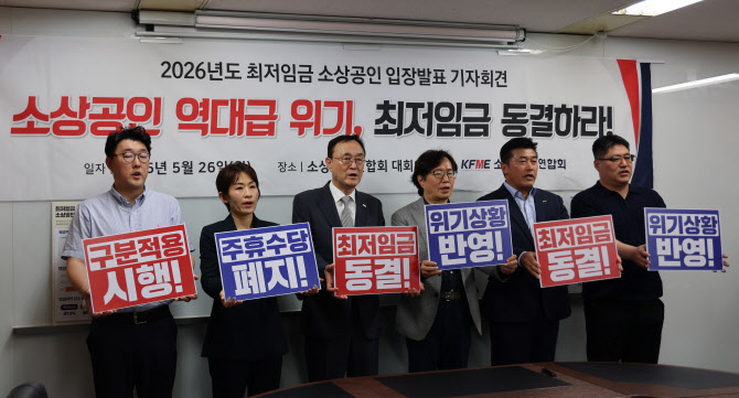 소상공인연합회는 26일 서울 여의도 소상공인연합회 대회의실에서 ‘2026년도 최저임금 소상공인 입장 발표 기자회견’을 개최하고 최저임금 동결을 주장하고 나섰다. 오는 27일 제2차 최저임금 전원회의에서 본격적인 최저임금 심의가 진행될 예정이다.