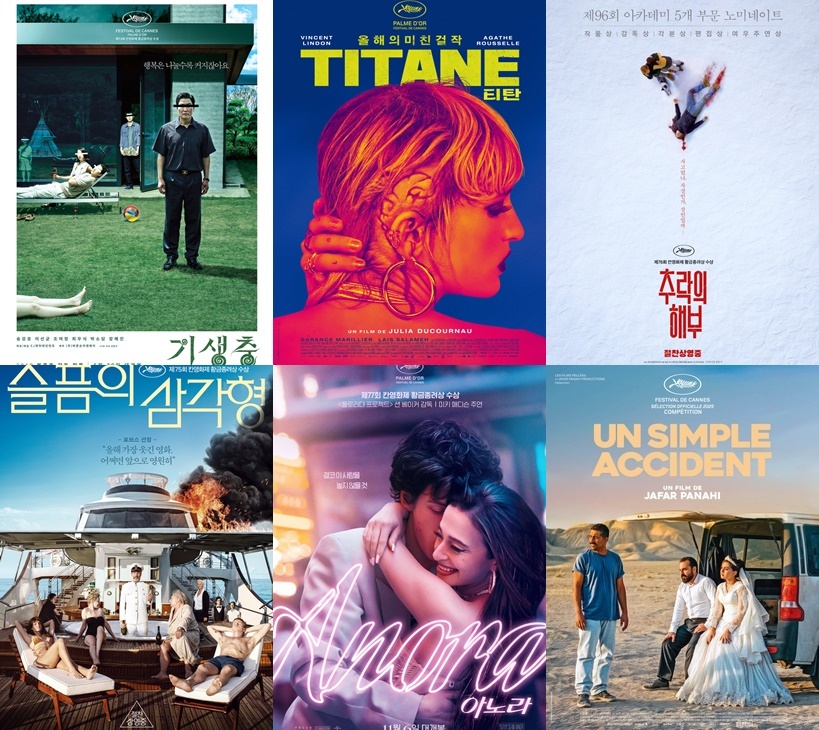 왼쪽 위부터 시계방향으로 '기생충' '티탄' '추락의 해부' '잇 워즈 저스트 언 액시던트' '아노라' '슬픔의 삼각형' 포스터 |