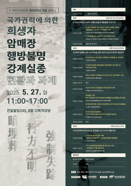 1세션에선 허연식 전 5·18민주화운동 진상규명조사위원회 과장이 ‘5·18민주화운동 당시 민간인 사망자 암매장 실태와 행방불명자 소재 확인 조사현황과 과제’에 관해 이야기한다. 또 ‘5·18행방불명자 소재 확인 조사 경과와 사례’(한송희 전 국방부 5·18민주화운동진상규명조사지원단)도 발표한다.
