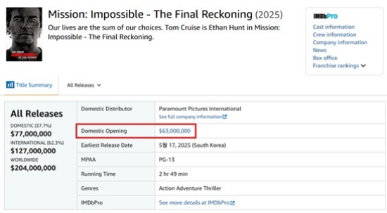 '미션 임파서블: 파이널 레코닝'은 5,468만 달러의 북미 오프닝 스코어를 달성했던 '미션 임파서블: 데드 레코닝'과 시리즈 최고 수익을 기록한 '미션 임파서블: 폴아웃'(최종 월드와이드 수익 8억 2,417만)의 북미 오프닝 수익인 6,123만 달러까지 뛰어넘는 기록을 세워 강력한 글로벌 흥행 신드롬에 귀추가 주목된다.