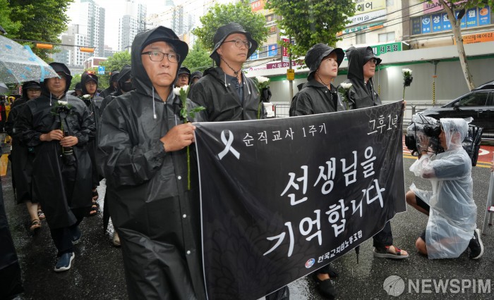 [서울=뉴스핌] 최지환 기자 = 서이초등학교 교사 사망 1주기를 맞은 18일 오전 서울 서초구 서이초교사거리에서 교원단체 회원들이 서초경찰서로 행진하고 있다. 2024.07.18 choipix16@newspim.com |