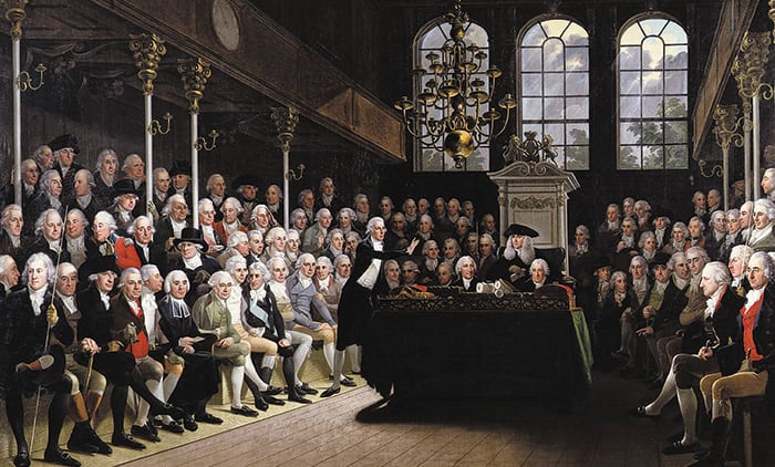 안톤 히켈이 그린 ‘1793~94년의 하원’. 영국이 프랑스 혁명 전쟁에 처음 참전했을 당시 영국 의회 하원을 묘사했다. 윌리엄 피트(가운데 서서 손짓하는 인물) 총리가 회의장에서 토론을 벌이고 있다. /영국 국립초상화미술관 소장 |