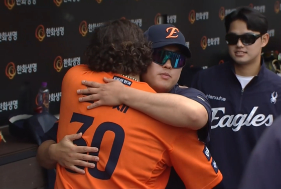 지난 17일 SSG전에서 자신의 기록을 깬 폰세에게 축하의 허그를 건네는 류현진. 사진 티빙 중계화면 캡처 |