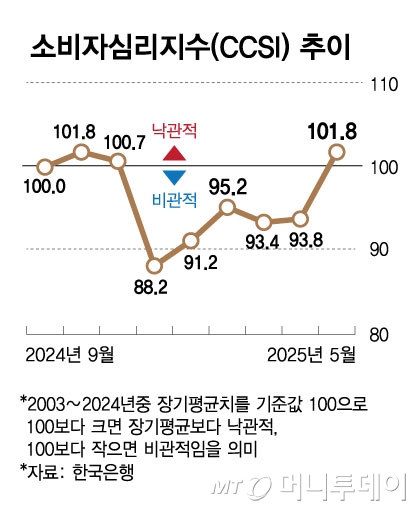 이혜영 한은 경제통계1국 경제심리조사팀장은 "소비자심리지수가 장기평균을 상회하며서 크게 개선되긴 했지만 그동안 낮은 수준에 머물렀던 것에 대한 기저효과가 일부 반영됐다"며 "그동안 심리회복을 제약했던 정치 불확실성과 관세정책 등 부정적 요인이 완화되면서 상승한 것"이라고 평가했다.