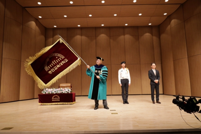 행사는 △내빈 소개 △총장 약력 소개 △교기 전달 △취임사 △축사 △꽃다발 증정 △축하 공연 △교가 제창 순으로 진행됐다.