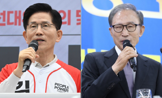 김문수 국민의힘 대선후보(왼쪽)와 이명박 전 대통령. 〈사진=연합뉴스〉 |