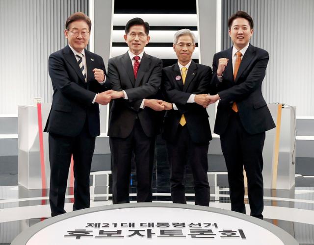 이재명 더불어민주당(왼쪽부터), 김문수 국민의힘, 이준석 개혁신당, 권영국 민주노동당 대선 후보가 23일 서울 영등포구 KBS본관 스튜디오에서 중앙선거방송토론위원회 주관 제21대 대통령선거 2차 후보자 토론회 시작에 앞서 기념 촬영을 하고 있다. 뉴스1 |