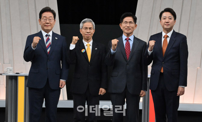 [국회사진기자단] 더불어민주당 이재명(왼쪽부터), 민주노동당 권영국, 국민의힘 김문수, 개혁신당 이준석 대선 후보가 27일 서울 마포구 상암동 MBC 스튜디오에서 진행된 정치 분야 TV토론회에 앞서 포즈를 취하고 있다. |