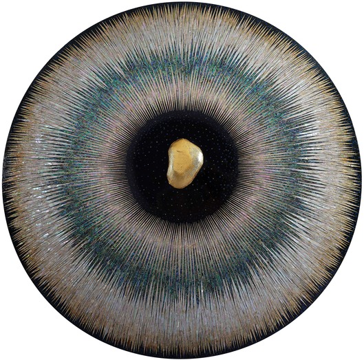 옻칠로 뒤덮인 원형 캔버스 앞에 서니, 중심에서 퍼져 나오는 에너지에 빨려 들어갈 것만 같다. 표면에 붙인 자개 조각이 밤하늘의 별무리처럼 흩어지고, 끝을 알 수 없는 우주 속을 떠도는 느낌도 든다.