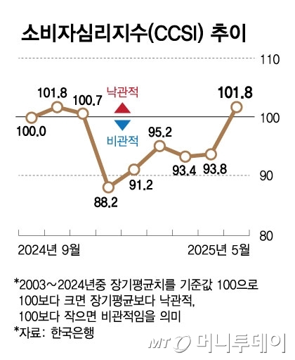 한국은행이 27일 발표한 '5월 소비자동향조사'에 따르면 이달 중 소비자심리지수(CCSI)는 101.8로 전월 대비 8포인트(p) 올랐다. 2020년 10월(+12.3p) 이후 4년7개월 만에 가장 큰 상승 폭이다. 소비자심리지수가 100보다 높으면 '낙관적', 100보다 낮으면 '비관적'이라고 본다.