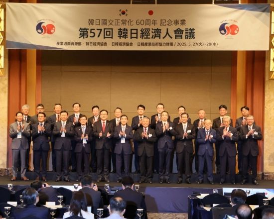 27일 서울 중구 롯데호텔에서 열린 '제57회 한일경제인회의'에 참석한 양국 경제인들이 회의 시작에 앞서 기념촬영을 하고 있다. 앞줄 왼쪽부터 조현준 회장, 박승희 사장, 신동빈 회장, 윤진식 회장, 정인교 산업통상자원부 통상교섭본부장, 김윤 한일경제협회 회장, 아소 유타카 일한경제협회 부회장, 미즈시마 대사, 코지 회장, 우에다 회장, 이미즈 사장, 나루세 회장. 2025.05.27 윤동주 기자 |