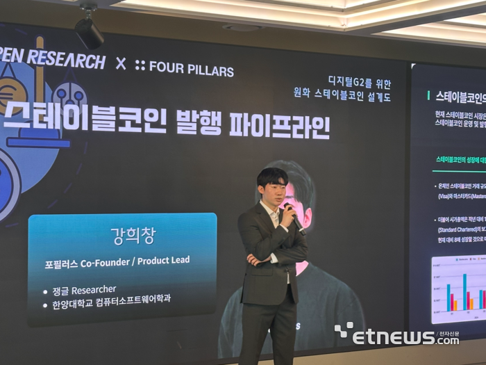 강희창 포필러스 프로덕트 리드 28일 서울 강남 해시드라운지에서 열린 '디지털 G2를 위한 원화 스테이블코인 설계도'에서 스테이블코인 발행 인프라 관련 발표를 하고 있다. (사진=박유민 기자) |