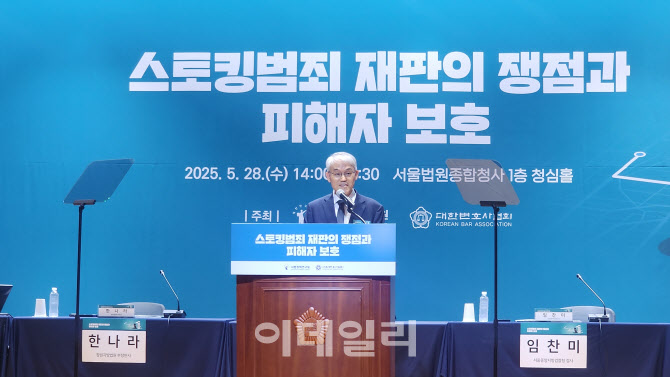 천대엽 법원행정처장이 28일 서초동 법원종합청사 청심홀에서 열린 ‘스토킹범죄 재판의 쟁점과 피해자 보호’ 학술대회에서 축사를 하고 있다. (사진=백주아 기자) |