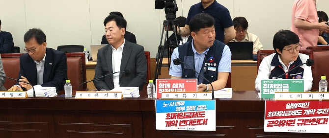 최저임금위원회 사용자위원인 류기정(왼쪽부터) 한국경영자총협회 전무, 이명로 중소기업중앙회 인력정책본부장과 근로자위원 류기섭 한국노총 사무총장, 이미선 민주노총 부위원장이 27일 정부세종청사에서 열린 최저임금위원회 제2차 전원회의에 나란히 자리하고 있다.(사진=연합뉴스) |