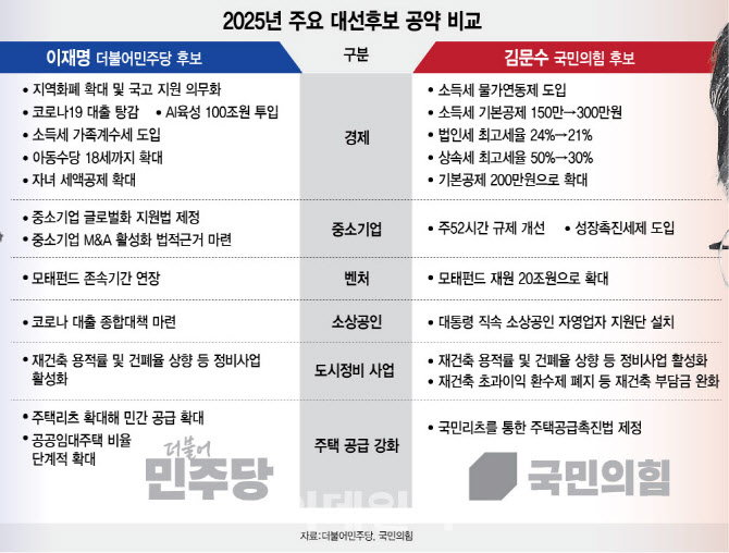 새출발기금 이용 대상을 확대하고 소상공인 맞춤형 금융상품을 마련한다는 공약은 양당이 뜻을 같이했다. 이 후보와 김 후보 모두 소상공인 이자부담 경감에 초점을 맞췄으며 소상공인 전문은행 설립을 약속했다. 다만 이 후보는 소상공인 등 취약계층에 대한 중금리대출 전문 인터넷은행 설립을, 김 후보는 소상공인 전문 국책은행 설립을 내세워 차이를 보였다.