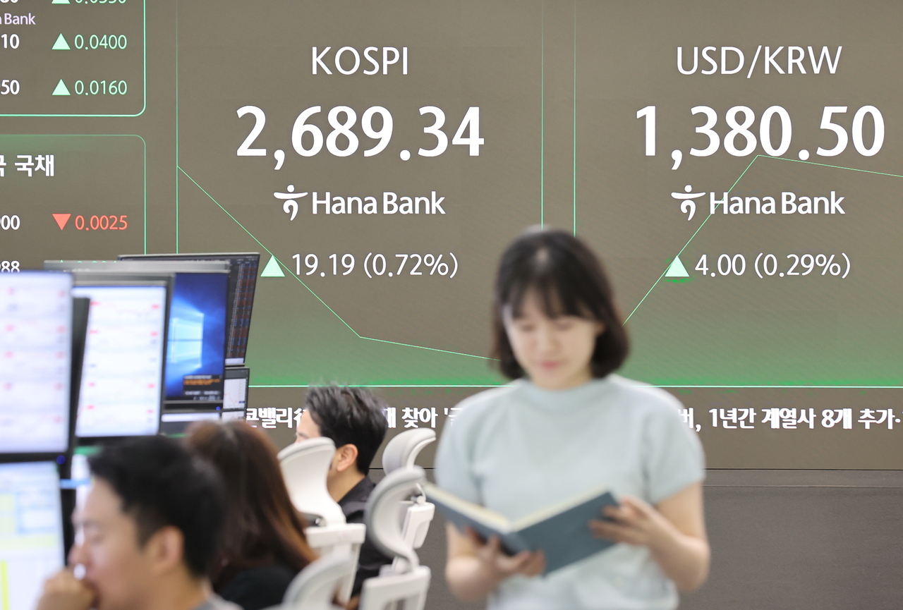 29일 서울 중구 하나은행 본점 딜링룸에서 직원들이 업무를 보고 있다. 이날 코스피는 전장보다 20.91포인트(0.78%) 오른 2,691.06으로 시작했다. [연합] |