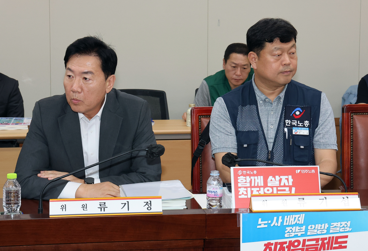 최저임금위원회 사용자위원인 류기정 한국경영자총협회 전무(왼쪽)와 근로자위원 류기섭 한국노총 사무총장이 29일 정부세종청사에서 열린 최저임금위원회 제3차 전원회의에서 나란히 자리하고 있다. [연합] |