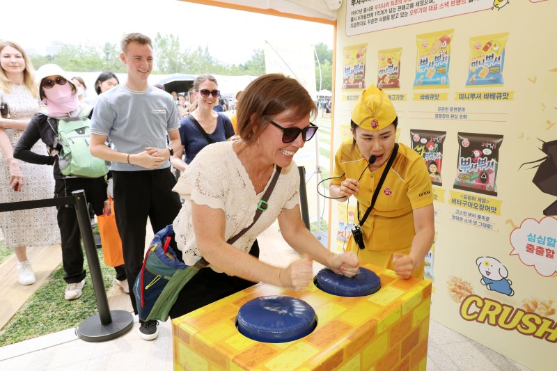 29일 서울 중구 서울광장에서 열린 '2025 서울식품유통대전(K푸드쇼)'에 참가한 오뚜기의 뿌셔뿌셔 부스에서는 연신 '팡팡' 소리가 났다. 오뚜기 대표 제품인 부셔먹는 스낵 '뿌셔뿌셔'에서 착안한 부스였다. 양손을 모두 써 두드리는 펀치게임에 성공하면 미니뿌셔를 주는 이벤트에 참여한 사람들은 분위기를 북돋는 행사 진행자의 멘트에 연신 깔깔댔다.