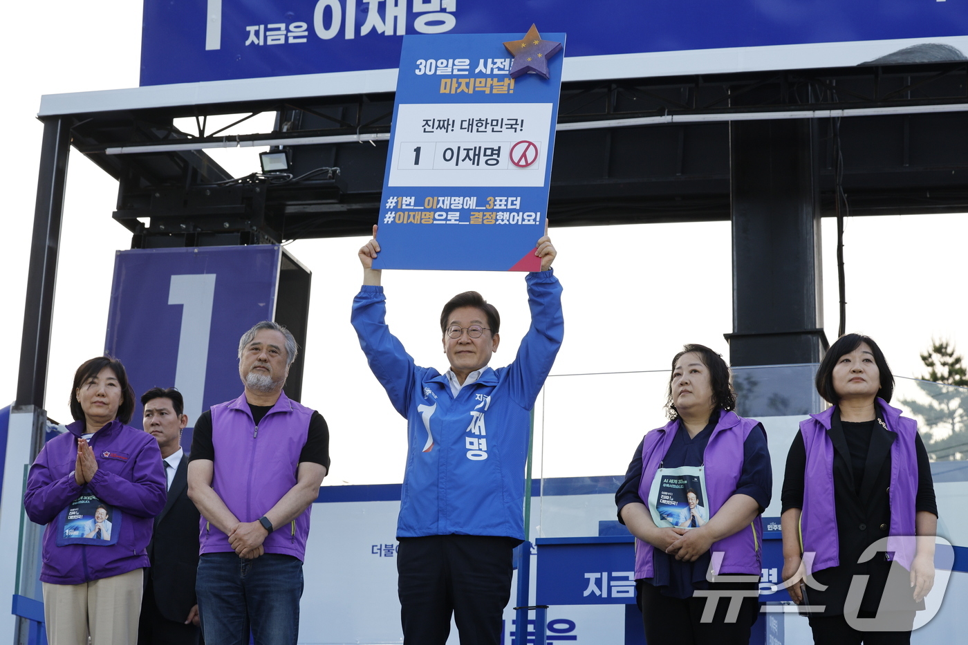 (서울=뉴스1) 안은나 기자 = 이재명 더불어민주당 대통령 후보가 제21대 대통령선거 사전투표 첫날인 29일 오후 서울 관악산으뜸공원에서 이태원 참사 유가족들과 함께 지지를 호소하고 있다. 2025.5.29/뉴스1