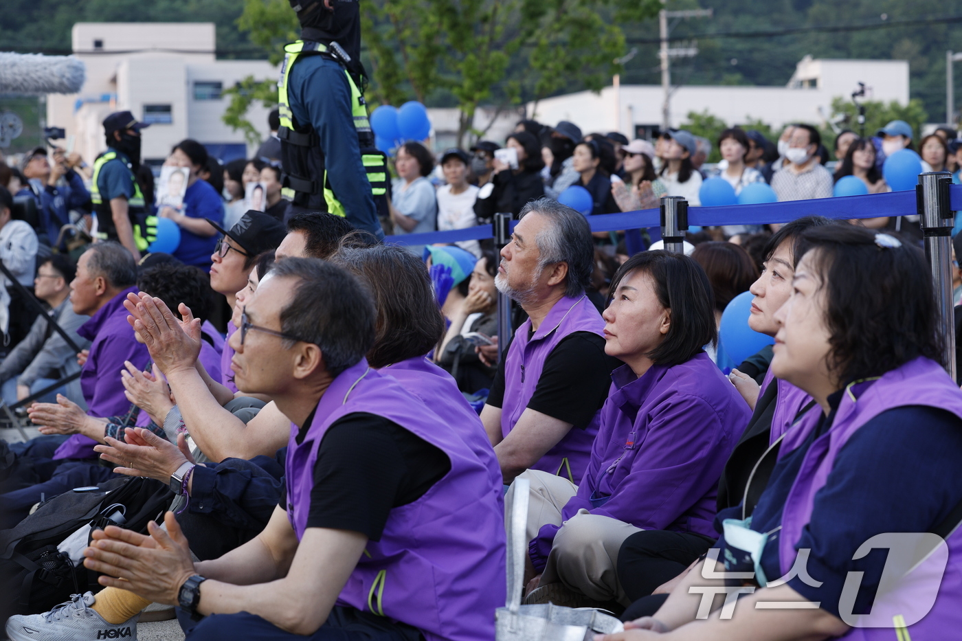 (서울=뉴스1) 안은나 기자 = 이재명 더불어민주당 대통령 후보가 제21대 대통령선거 사전투표 첫날인 29일 오후 서울 관악산으뜸공원에서 열린 유세현장에 이태원 참사 유가족들이 참석해 자리하고 있다. 2025.5.29/뉴스1
