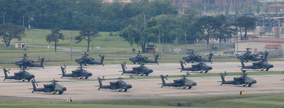 지난 23일 경기 평택시 팽성읍 주한미군기지 캠프 험프리스에 아파치 헬기가 계류되어 있는 모습. 뉴스1 |
