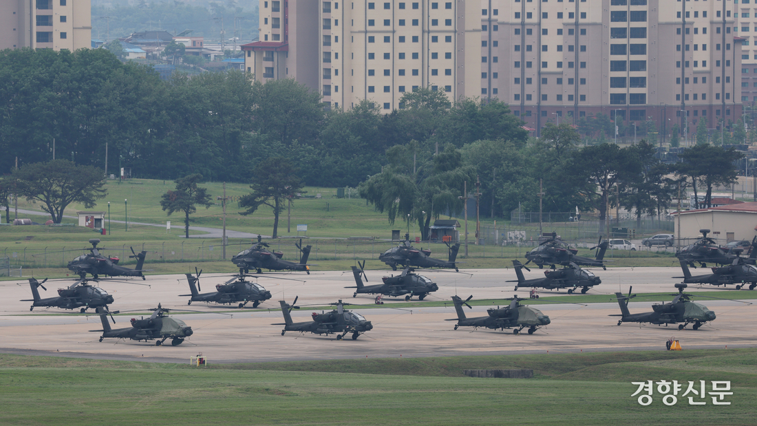 미국 언론이 미 정부가 주한미군 감축을 검토하고 있다고 보도한 23일 경기 평택시 주한미군기지 캠프 험프리스에 헬기가 계류돼 있다. 반면 국방부는 “논의된 바 전혀 없다”며 선을 그었다. 정효진 기자 |