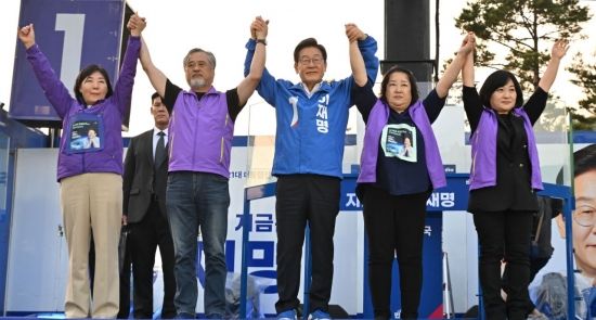이재명 더불어민주당 대선 후보가 29일 서울 관악구 관악산으뜸공원에서 열린 유세에서 이태원참사 유가족들과 함께 지지를 호소하고 있다.
