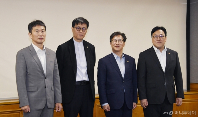 (서울=뉴스1) = 김범석 기획재정부 장관 직무대행 1차관이 30일 오전 서울 중구 은행회관에서 열린 '거시경제·금융현안 간담회'에서 이복현 금융감독원장, 이창용 한국은행 총재, 김병환 금융위원장과 기념촬영하고 있다. (기획재정부 제공. 재판매 및 DB금지) 2025.5.30/뉴스1 |