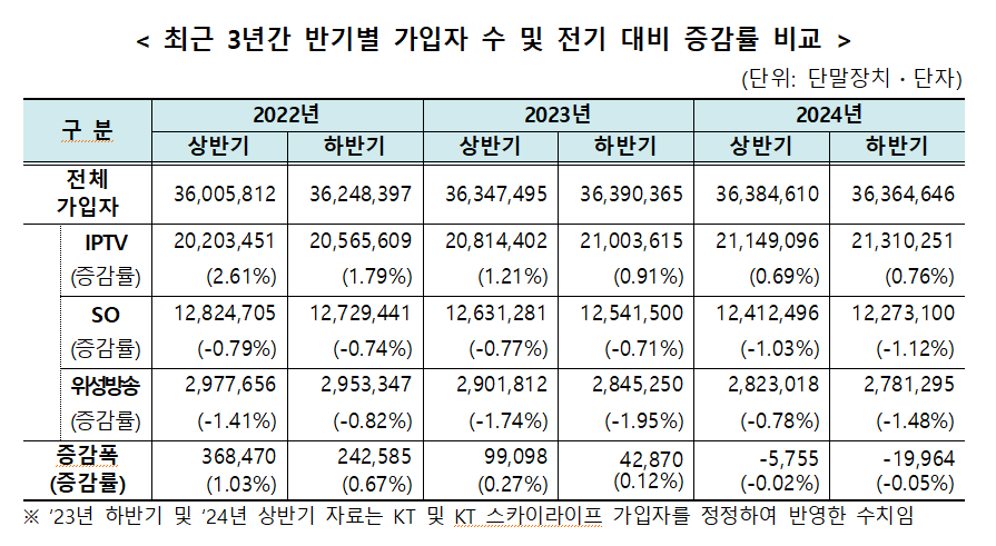 정부에 따르면 유료방송 시장점유율 산정 기준에 따른 2024년 하반기 유료방송 가입자 수는 3636만4646명으로, 같은 해 상반기 대비 1만9964명 줄었다. 2024년 상반기에 유료방송 가입자 수가 처음 줄어든 이후 연속으로 감소했으며, 감소 폭은 직전 반기 대비 확대됐다.