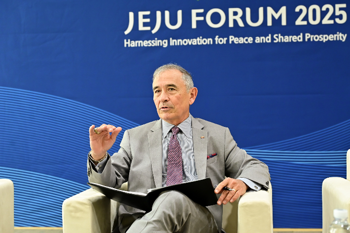 해리 해리스 전 주한미국대사가 30일 제주국제컨벤션센터에서 기자들과 간담회를 가지고 있다. 제주포럼 사무국 제공 |