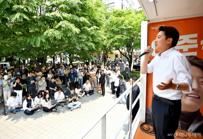이준석 개혁신당 대통령 후보가 30일 오후 서울 마포구 경의선 숲길에서 유권자들에게 지지를 호소하고 있다. (공동취재) 2025.5.30/사진=뉴스1 /사진=(서울=뉴스1) 이승배 기자 |