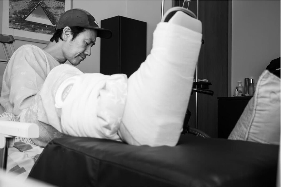 엄태웅은 30일 자신의 소셜 미디어에 별다른 설명 없이 사진 한 장을 게재했다. 공개된 사진에는 오른쪽 다리를 깁스하고 얼음 주머니까지 동여맨 엄태웅이 인상을 쓰고 있는 모습이 담겼다. 엄태웅 뒤로 놓여진 목발도 눈에 띈다.