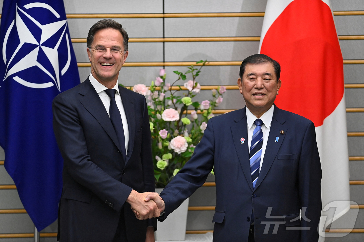 이시바 시게루 일본 총리가 9일(현지시간) 도쿄 총리 관저에서 마르크 뤼터 나토 사무총장과 회담에 앞서 악수를 하고 있다. 2025.04.10 ⓒ 로이터=뉴스1 ⓒ News1 우동명 기자 |