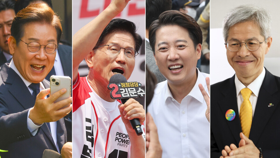 물론 약 2주전까지 이 후보가 50% 지지율을 넘긴 반면 김 후보는 20%대를 넘지 못하는 조사 결과가 쏟아지던 때보다는 전반적으로 격차가 줄어들었습니다. 윤석열 탈당과 한동훈 전 대표의 유세 가세 등으로 어느 정도 보수 결집이 이뤄지면서 벌어진 현상으로 풀이됩니다. 이재명 후보의 커피 원가 발언과 ‘호텔 경제학’ 예시, 민주당의 대법관 증원 법안 등에 대한 보수 후보들과 매체의 공세가 거세진 것도 같은 시기의 일입니다.