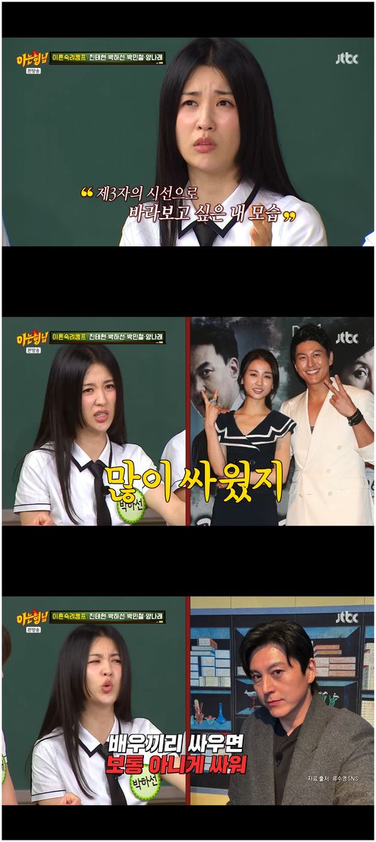 이어 박하선은 “실제로 류수영에게 잘해준다”라며 “신혼 때면 정말 많이 싸운다. 특히 부부끼리 싸우면 정말 크게 싸운다. 그런데 이게 또 악역끼리 싸우는 느낌을 준다”라면서 시니컬하게 말해 웃음을 안겼다. 그는 “나도 저렇게 될까 봐, 그리고 나도 내가 3자의 시선으로 보고 싶더라. 솔직히 ‘이숙캠’ 출연하고 싶다”라고 말해 모두를 깜짝 놀라게 했다./osen_jin0310@osen.co.kr