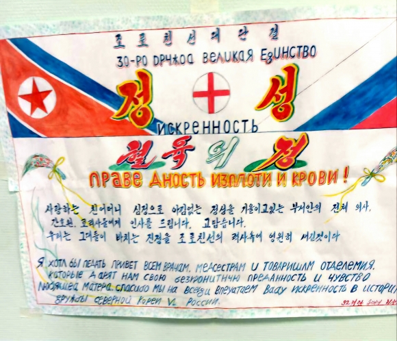 북한·러시아 국기와 의료진의 얼굴, 우크라이나 전쟁(특별군사작전) 승리를 뜻하는 ‘Z’ 표식도 직접 정성스럽게 그려넣었다.