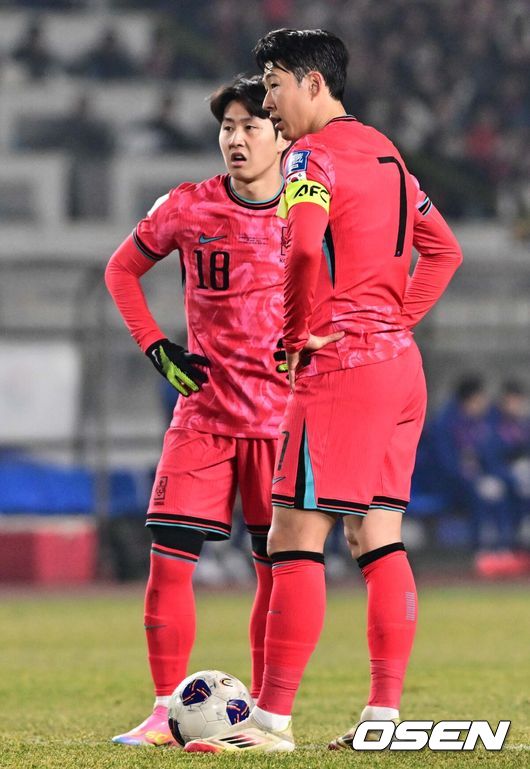[OSEN=고양, 조은정 기자]20일 오후 경기도 고양종합운동장에서 2026 국제축구연맹(FIFA) 북중미 월드컵 아시아지역 3차 예선 B조 7차전 한국과 오만의 경기가 열렸다.승점 14점(4승 2무)으로 B조 1위를 유지하고 있는 한국이 오만전과 25일 예정된 요르단전에서 모두 승리해 승점 6점을 얻어낸다면,6월예정된이라크, 쿠웨이트와 경기 결과와 상관없이 11회 연속 월드컵 본선 진출을 확정 짓는다. 전반 한국 이강인, 손흥민이 프리킥을 준비하고 있다. 2025.03.20 /cej@osen.co.kr |