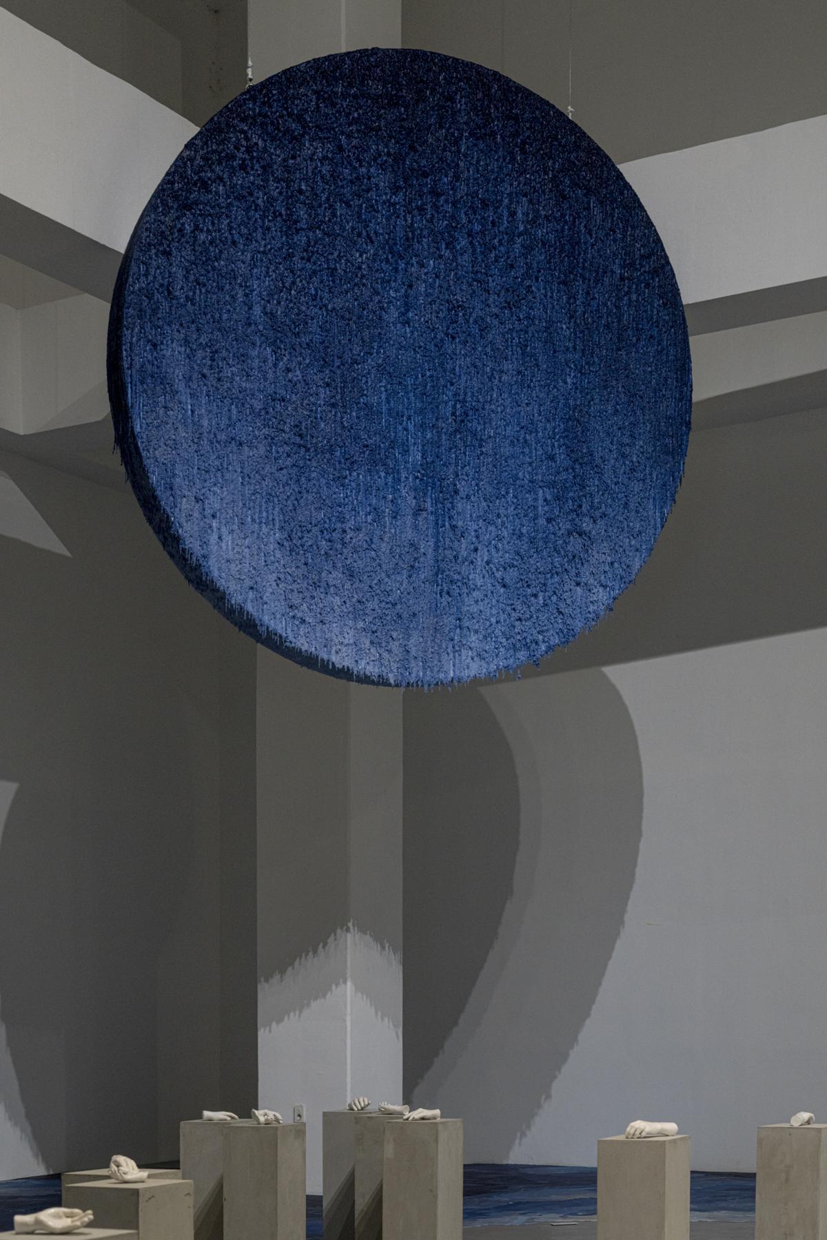이를테면 김덕희 작가의 설치작품 ‘밤의 노래’는 공중에 뜬 푸른색 원형 형체 아래 손 조각들이 놓여 있다. 마치 손을 잡아 달라는 듯한 모양의 조각을 만지면 따뜻한 온기가 전해지는데, 이는 조각 속에 열선을 설치해서 만들어진 효과다.