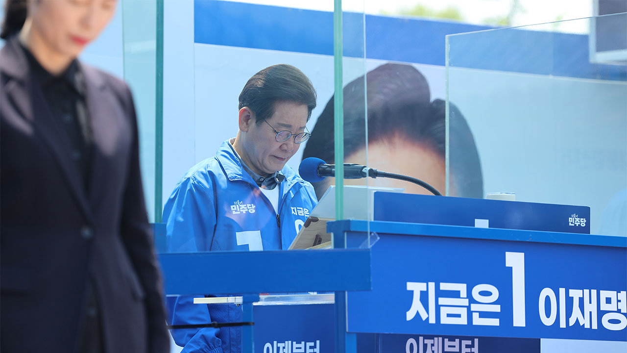 ▲ 더불어민주당 이재명 대선 후보가 선거를 이틀 앞두고 '험지 공략'에 나선 1일 고향인 경북 안동시의 웅부공원에서 열린 유세에서 해군 초계기 사고 순직자들을 추모하며 묵념하고 있다.