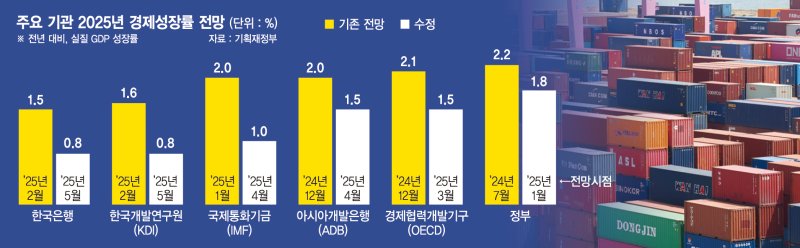 지난달 말 한은은 올 성장률 전망치를 기존(2월 전망) 대비 절반가량 낮춘 0.8%로 수정했다. 한은은 수출도 -0.1%로 역성장할 것으로 내다봤고 건설투자는 6.1% 줄어들 것으로 예측했다. 3개월 전엔 수출은 0.9% 증가를, 건설투자는 2.8% 감소를 예상했다. 하지만 두 지표 모두 한층 더 '악화' 쪽으로 방향을 틀었다.