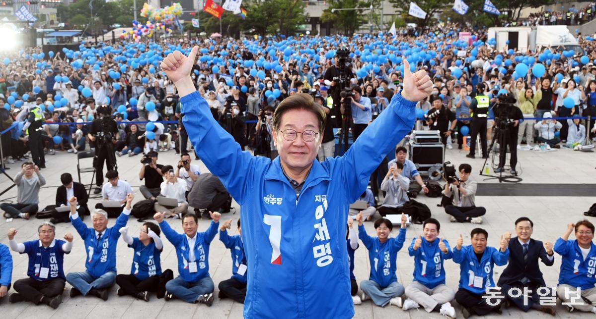 이재명 더불어민주당 대선 후보가 대선을 이틀 앞둔 1일 부산 동구 부산역 광장에서 유권자들에게 지지를 호소하고 있다. 사진공동취재단/이훈구 ufo@donga.com |