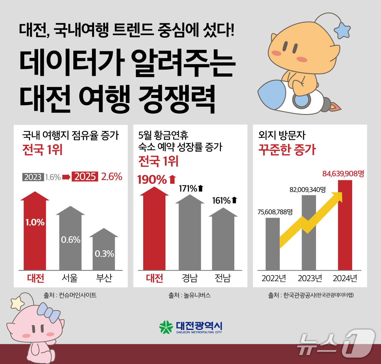 온라인 여행기업 ‘놀유니버스’가 발표한 황금연휴(5월 1~6일) 기간 숙박 예약 현황에서도 전년 대비 무려 190% 증가하며 전국 1위를 차지했다. 또한 한국관광공사의 2024년 지역별 방문객 통계에 따르면 대전 방문객은 총 8463만여 명으로 전년 대비 3.1% 증가했다.