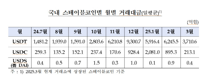 2일 한국은행이 국회 기획재정위원회 소속 차규근 조국혁신당 의원에게 제출한 자료에 따르면, 올 1분기 국내 5대 가상자산 거래소(업비트·빗썸·코빗·코인원·고팍스)에서 거래된 USDT, USDC, USDS 등 3종의 달러 표시 스테이블코인 거래대금은 총 56조 9537억원으로 집계됐다.
