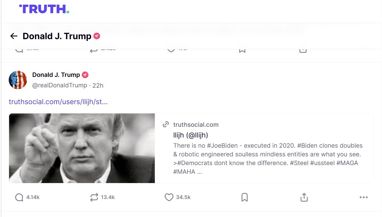 해당 게시물은 "조 바이든은 2020년 처형됐고 (현재) 존재하지 않는다"며 "두 개로 복제되고 지금 보고 있는 것은 로봇 공학으로 만들어진 영혼없는 무의미한 존재지만 민주당원들은 차이를 모른다"고 적었다. 해당 게시물의 계정자명은 llijh으로 '기독교 신자, 예수 그리스도는 군주이며 구세주다'라는 설명이 달렸다.