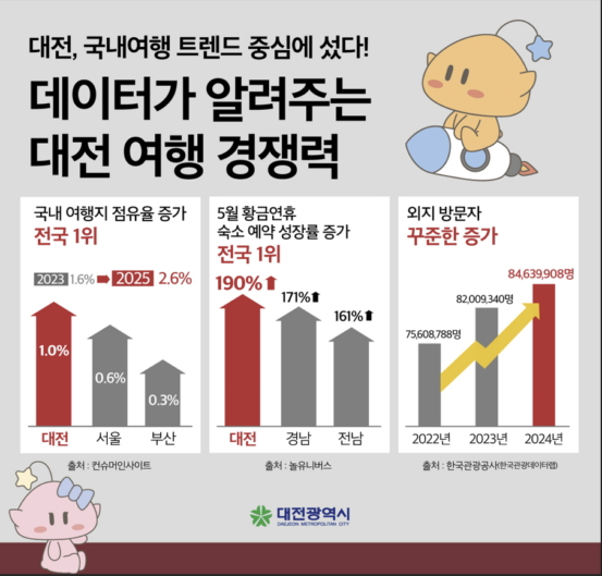 이러한 인기는 다양한 데이터에서도 확인된다. 온라인 여행기업 '놀유니버스'가 발표한 황금연휴(5월1~6일) 기간 숙박 예약 현황에서도 대전은 예약 건수가 전년 대비 무려 190% 증가하며 전국 1위를 차지했다. 또 한국관광공사의 지난해 지역별 방문객 통계에서도 대전 방문객은 총 8463만여명으로 전년 대비 3.1% 증가한 것으로 집계됐다.