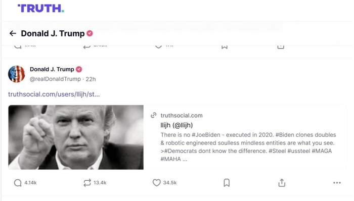 트럼프는 1일(현지시간) 자신의 플랫폼 ‘트루스소셜’에 해당 음모론을 주장하는 게시물 링크를 올렸다. 게시물은 “바이든은 존재하지 않으며 지금의 그는 로봇공학으로 만들어진 복제된 존재”라는 황당한 주장을 담고 있다. 해당 게시물의 계정자명은 llijh으로 ‘기독교 신자, 예수 그리스도는 군주이며 구세주다’라는 설명이 달렸다. 해당 계정은 공유 이전 팔로워가 5,000명대였으나, 이후 5만 명 이상으로 급증했다.