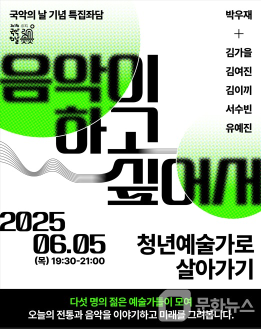 전통음악의 오늘과 미래를 만나보는 국악의 날 기념 특집좌담 '음악이 하고 싶어서, 청년예술가로 살아가기'는 오는 5일 저녁 7시 30분에 국악방송은 라디오로 청취할 수 있으며, 추후 유튜브 국악방송 라디오 채널을 통해 만나 볼 수 있다.