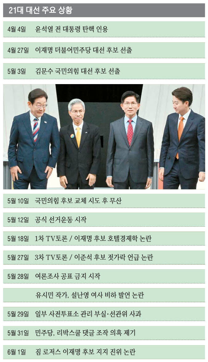 또 선거 막판에 네거티브 공세가 과열되면서 비난과 혐오 정치의 민낯을 여실히 보여줬다는 지적도 제기된다. 헌법재판소가 윤 전 대통령의 탄핵을 인용한 지난 4월 4일부터 지금까지 표심을 흔든 장면들을 되돌아봤다.